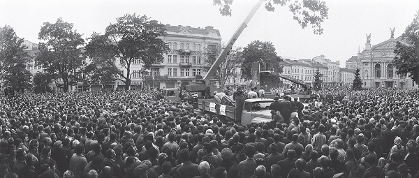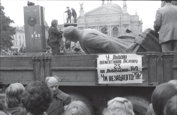 Партийные руководители Львовщины проиграли первые выборы народных депутатов еще в начале 1989 года[57], а местные Советы оказались в руках национал-демократов (часть из них еще сохраняла членство в КПСС) уже весной следующего года. Первый памятник Ленину в регионе был демонтирован усилиями не львовских студентов или «среднего класса», но в результате экономически мотивированных стихийных протестов — в шахтерском Червонограде на Львовщине 1 августа 1990 года[58]. В начале сентября того же года музей Ленина во Львове — к тому времени принявший более восьми миллионов посетителей — был заблокирован местными активистами. 14 сентября 1990 года, после многотысячных митингов, несмотря на формальную угрозу санкций со стороны все еще коммунистического Верховного Совета Украины, меркуровский монумент Ленину был с одобрения львовского горсовета во главе с Вячеславом Чорноволом демонтирован[59]. Попытки спасти Ленина как общесоюзного патрона перестройки и гаранта преемственности и целостности федерации (Указ президента СССР «О пресечении надругательства над памятниками, связанными с историей государства, и его символами» от 13 октября 1990 года) сошли на нет уже к весне-лету следующего года, последнего для СССР[60].