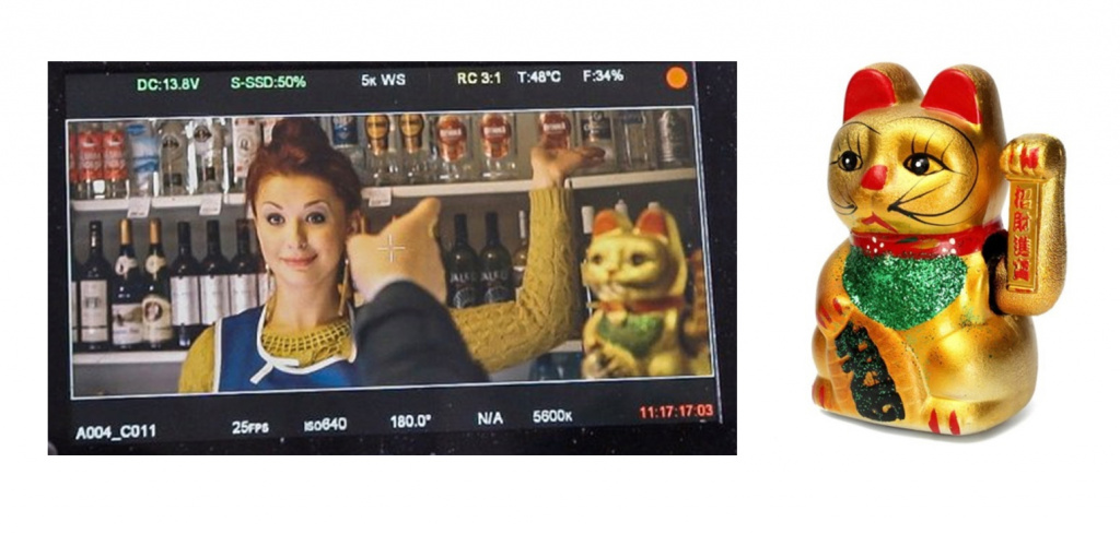 Кадр из клипа «В Питере — пить!»: продавщица водки, чей жест и цвет свитера срифмованы с китайской скульптурой Манэки-нэко